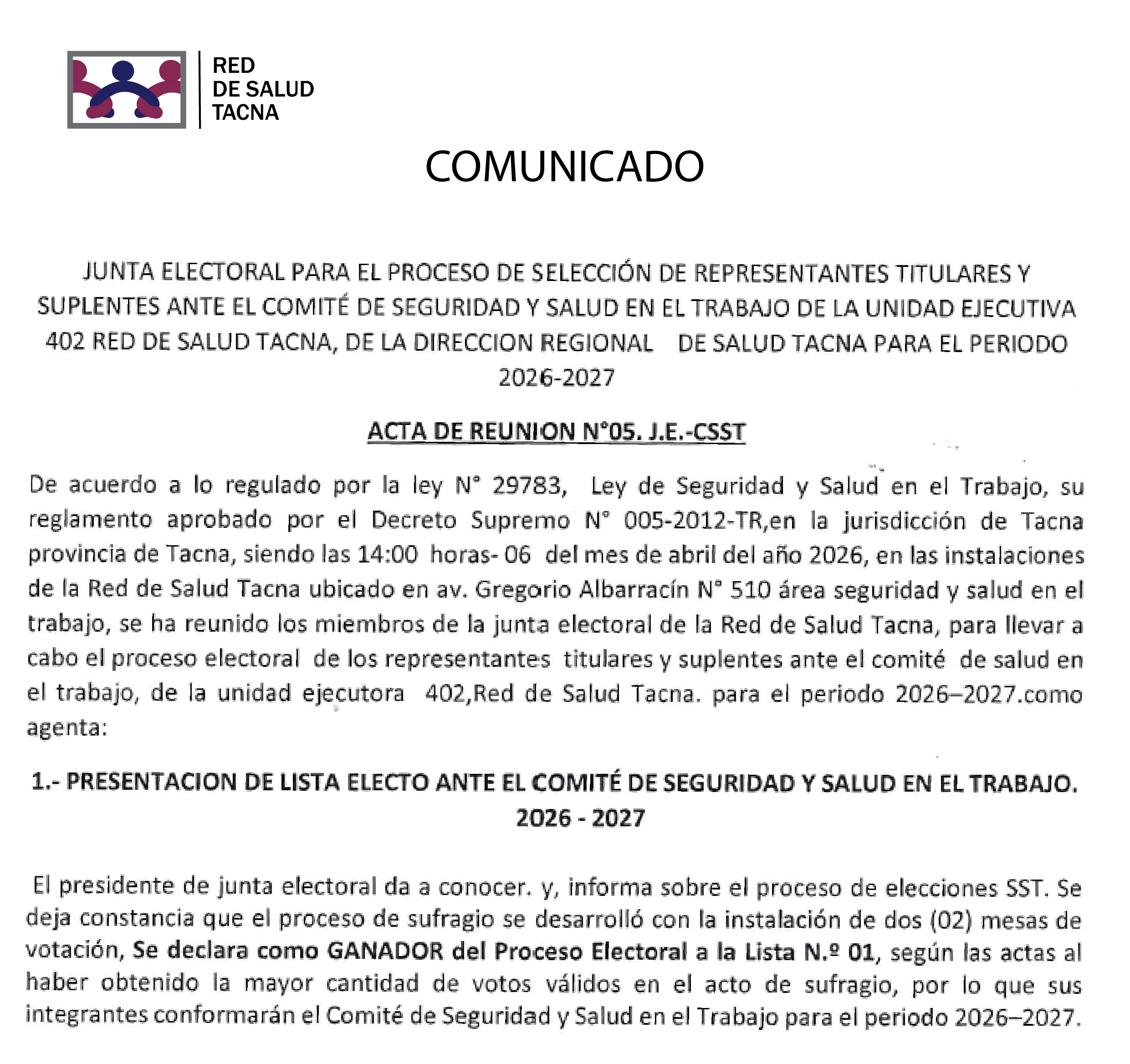 RD Nº 132-2026-UAJ-DE-REDS.T-DRS.T - APROBAR LA CONFORMACION DE LA JUNTA ELECTORAL DEL COMITE DE SEGURIDAD Y SALUD EN EL TRABAJO 2026-2027